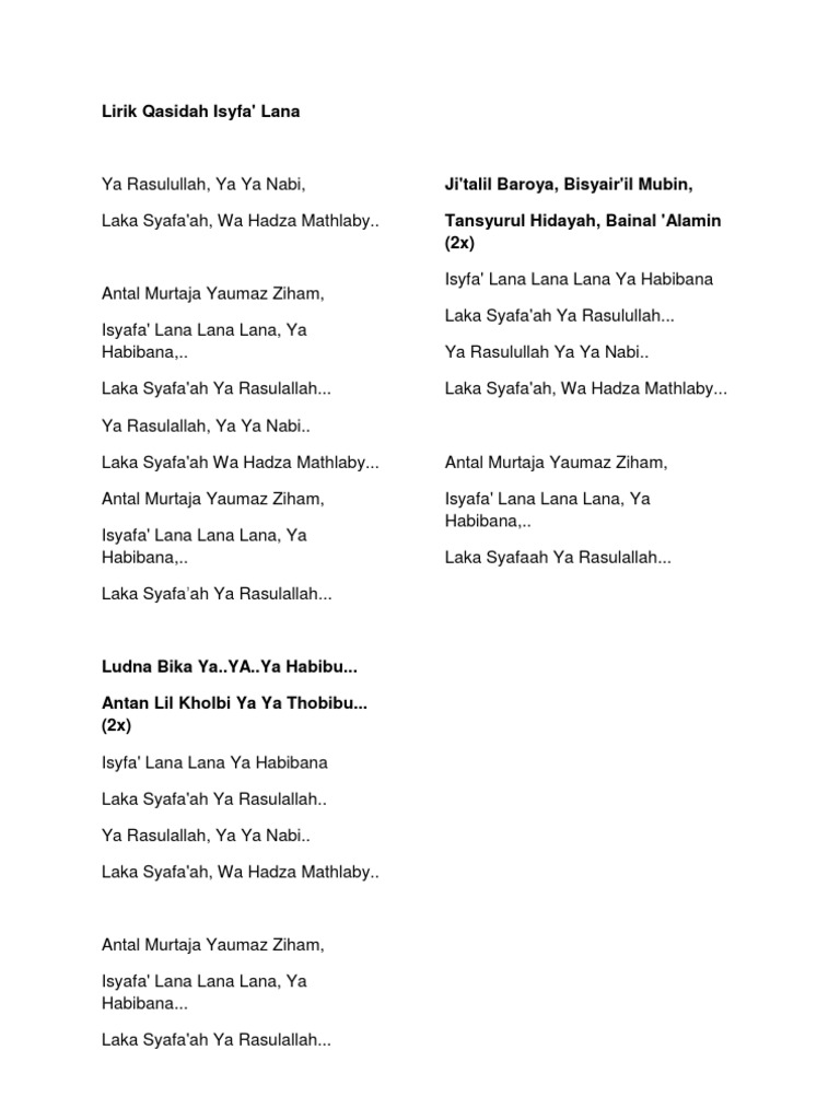 Lirik Qasidah Isyfa Lana
