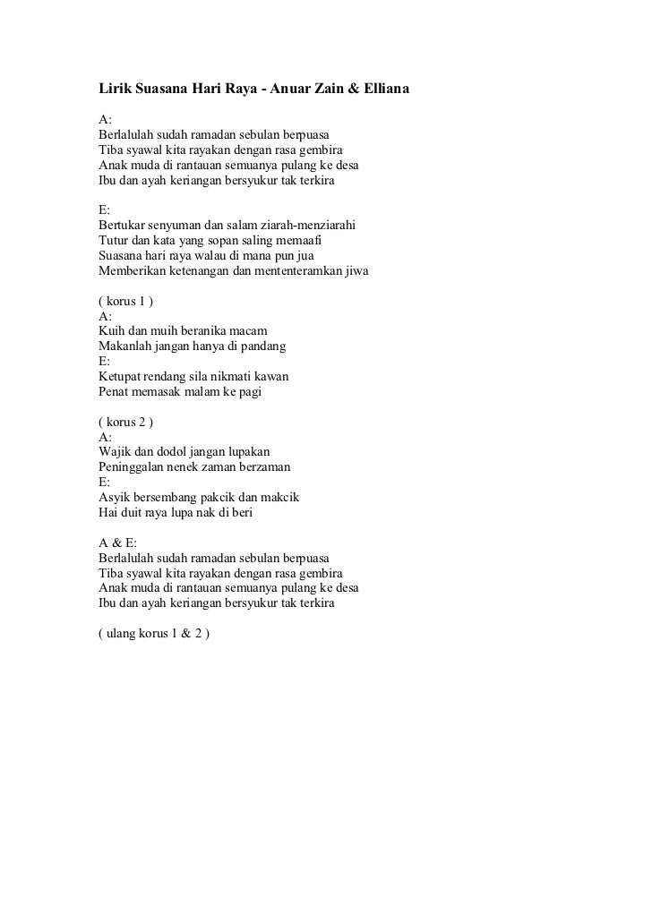 Lirik suasana hari raya. Lirik lagu suasana hari raya sharifah aini. Wajik dan dodol jangan lupakan peninggalan nenek zaman berzaman. Friday may 30 2014 jika ada sebarang masalah tentang chord lagu diatas sila buat aduan pada form report chord yang disediakan. Find more of anuar zain lyrics.